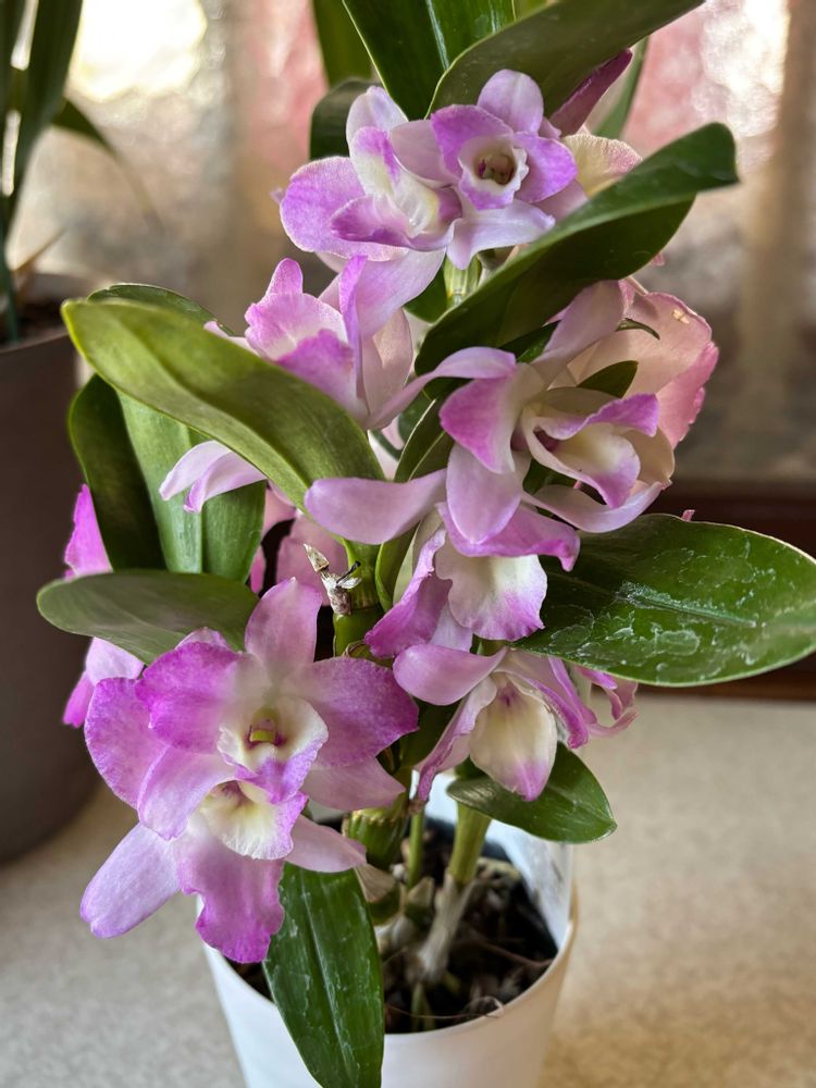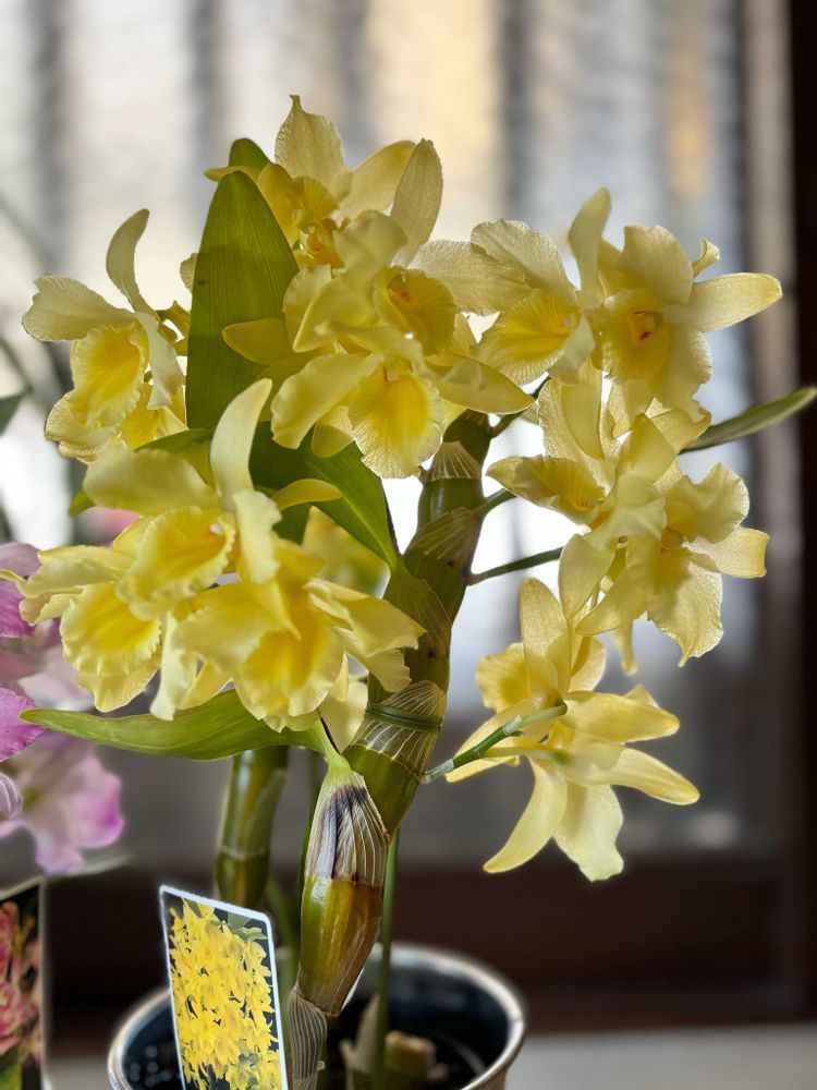 ①小型のデンドロビウム、先日、ご近所お花屋さんで見つけてしまい、可愛いお花と色、1つ1,000円程のお手頃プライスで我慢できずお迎えしてしまいました😆