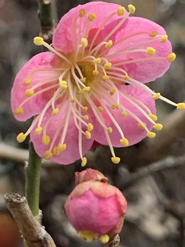 庭の紅梅が今年も咲き始めました🩷咲いたお花もぷくぷくツボミさんもどちらもかわいいです🩷