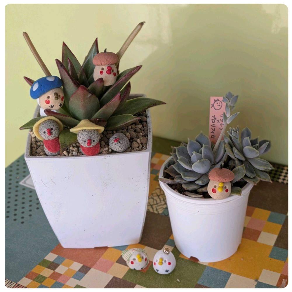 さーん、ピックじゃなくてね、月の雫さんが作ってるピータンちゃんなの〜モデル待機みたいにカウンターに並んで待っててくれています〜〜〜♥きのこ🍄やドングリって多肉ちゃんにピッタリだからねぇーー😋