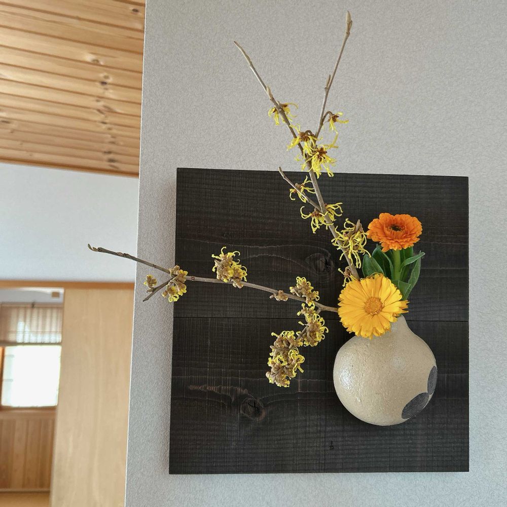 花器と、板が良いのでわりと何でも合うし、私もそこが気に入ってます🧡