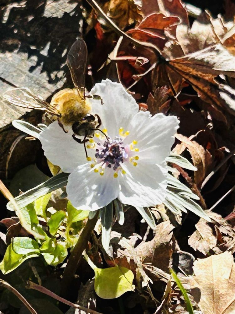 花の中心の黄色い蜜腺に誘われて🐝さんが、やってくるのですが、セツブンソウの受粉にも重要な役割をしてる🐝さんです。