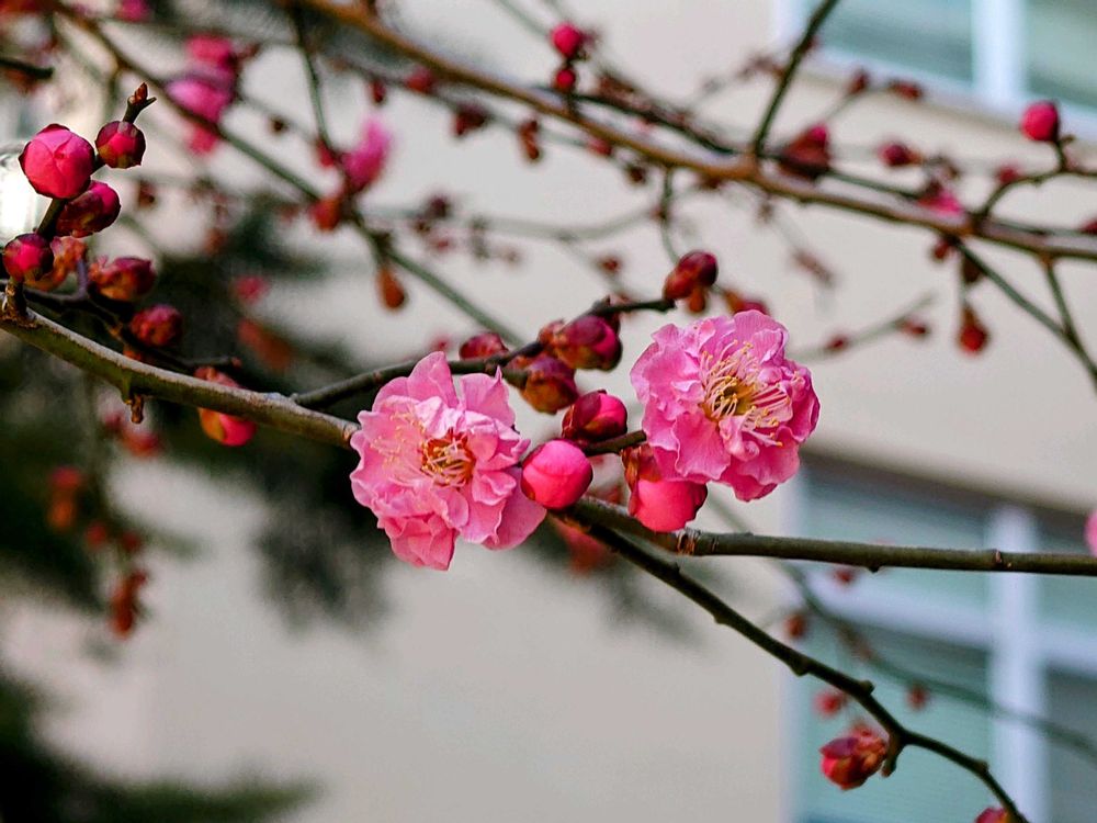 今日の午前中、市内を散歩途中に見かけた紅梅。