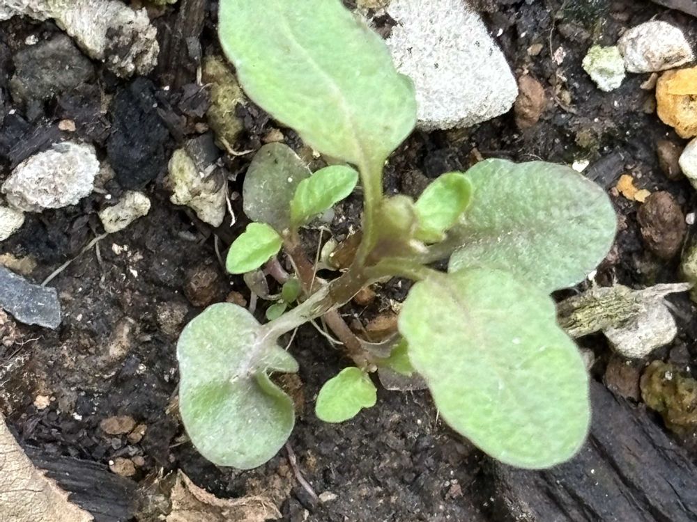 4枚目 溢れた種からのビオラの苗らしきものがいつの間にか育っています。ダンゴムシに食べられる前に鉢上げしようかな🌱