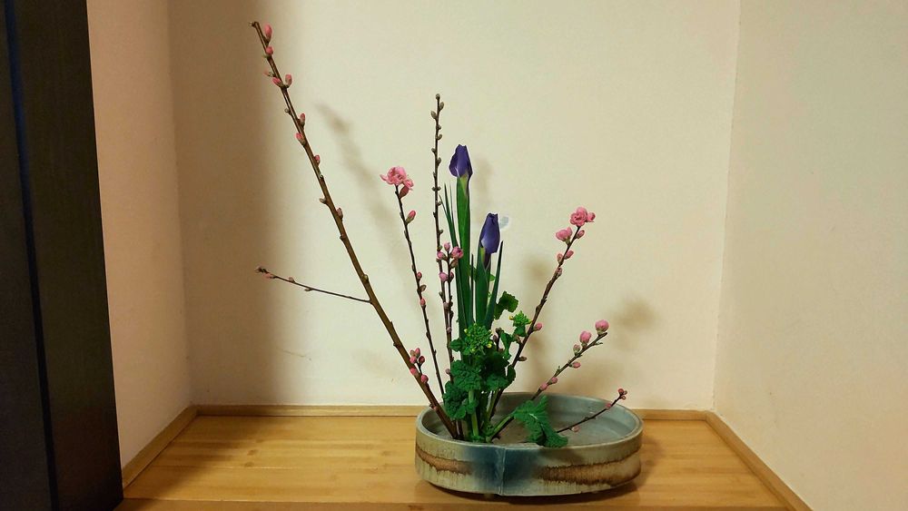 枝物を使って 自然な様子を生ける時は、枝物を先に挿して、枝だけで自然に庭で育っているような枝ぶりに見えるか、確認してから、花を入れていくといいと思います。