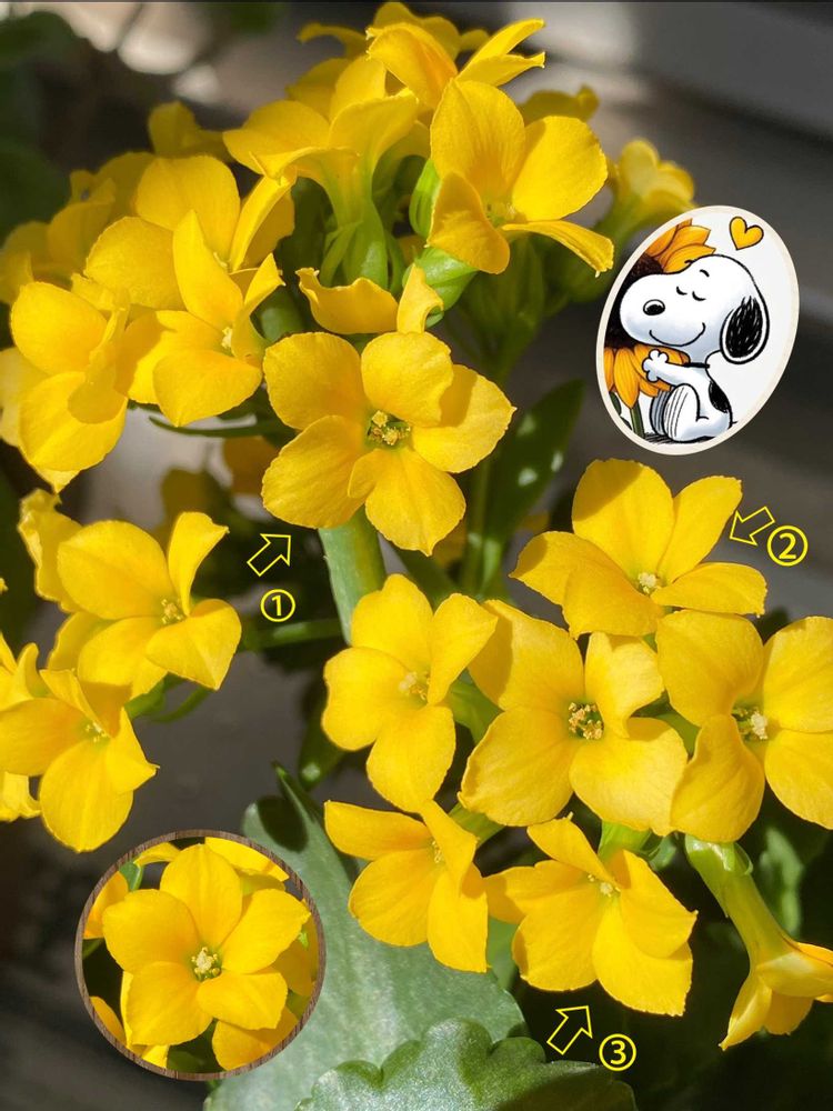スヌーピーちゃん!カランコエの5弁花、探して嬉しそうですね🥰
