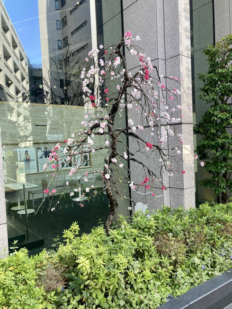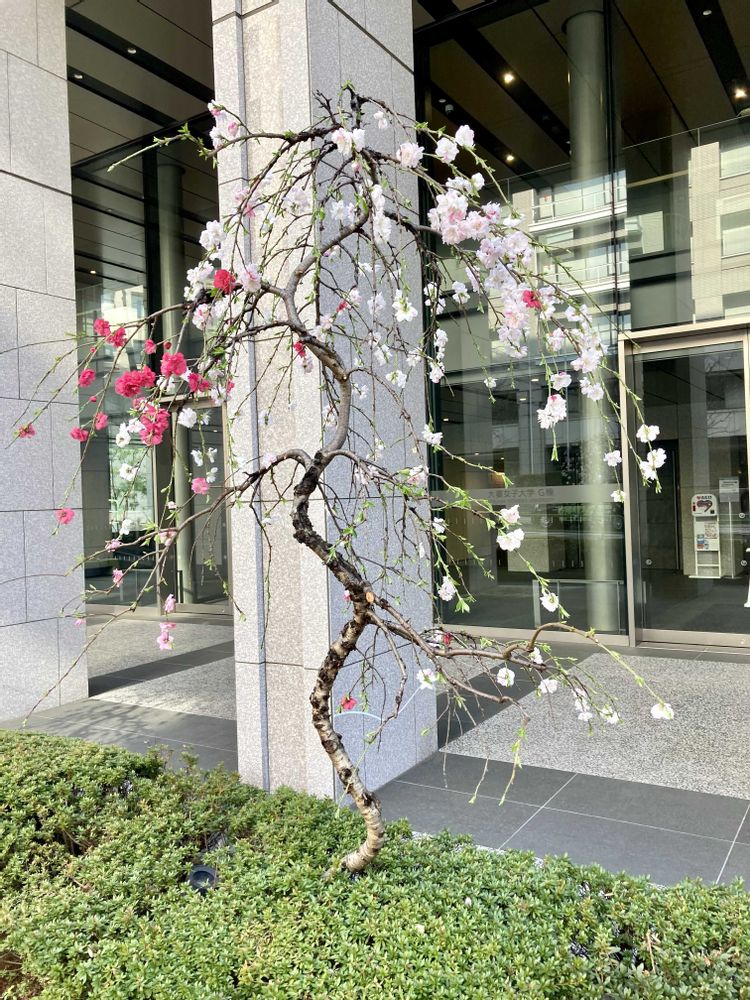 大妻女子大学の歩道沿いに咲いていた「モモ」の源平枝垂れ。