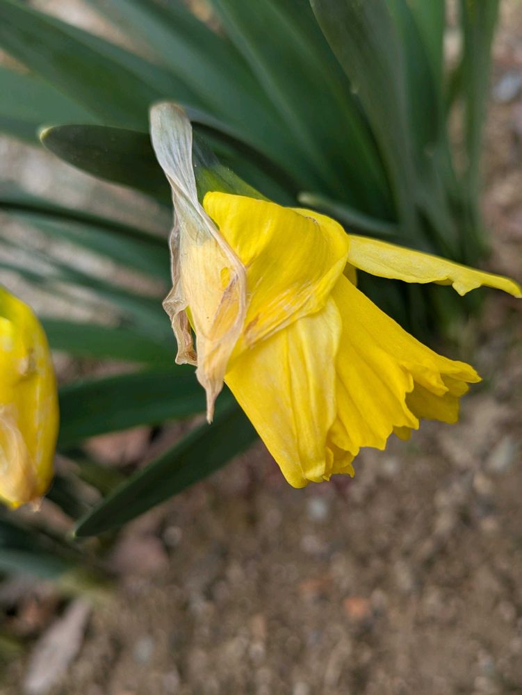 ラッパスイセンにも色々あるが、これは1茎1花で中央の副冠も黄色いタイプ💛早咲きのはずの日本水仙よりも、ご近所の庭では早く咲き出した 月曜日にビタミンカラー🏷