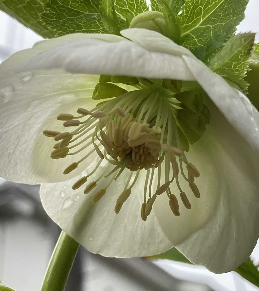 下向きに咲くクリスマスローズ(白)の花が開花しました。