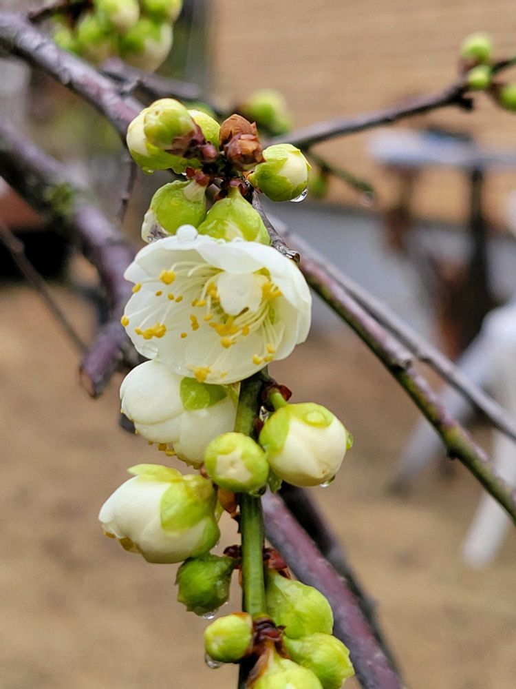 今朝、庭の枝垂れ白梅がようやく咲きました。