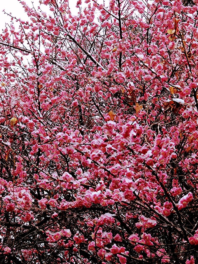 雨から雪が散らついて紅梅に雪が少し積りました❄