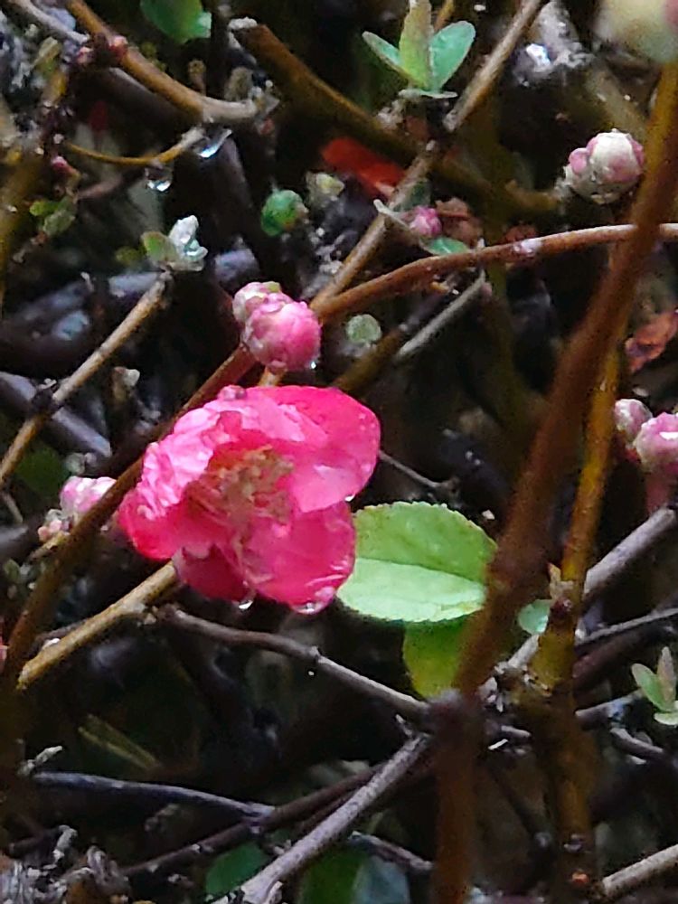 2️⃣ボケも咲きだして🌸雨に濡れて💧昨日は暖かくて咲いたのに🌸今日は冷たい雨💧