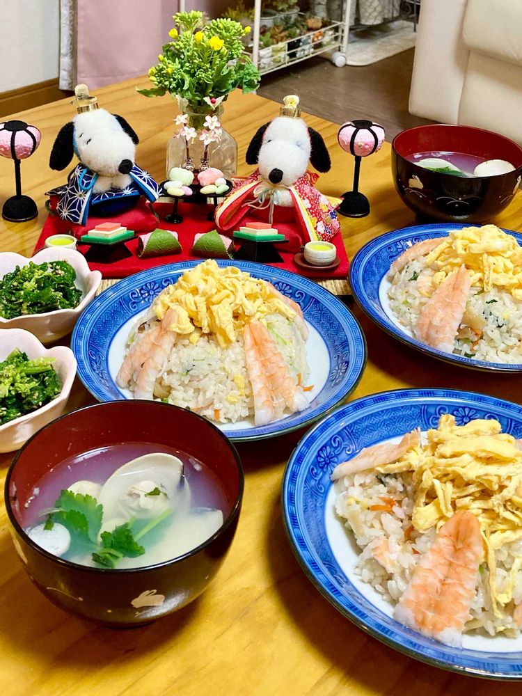 ひな祭りのごちそうが並んでいて、朝ごはん食べたのにお腹空いてきました(*´艸`*)ァハ♪🎎🍽️