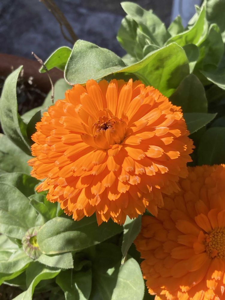 ポットマリーゴールドが、温かな日和に咲いていたので👍