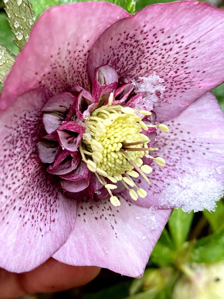 下向きでうまく写真が撮れなかったのに、雪でひっくり返り上を向いて咲いているお花ができた🌸と喜んでいます😰