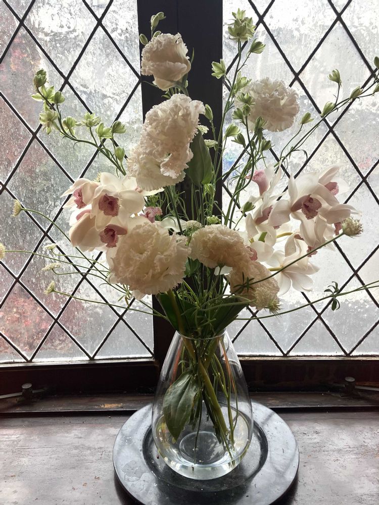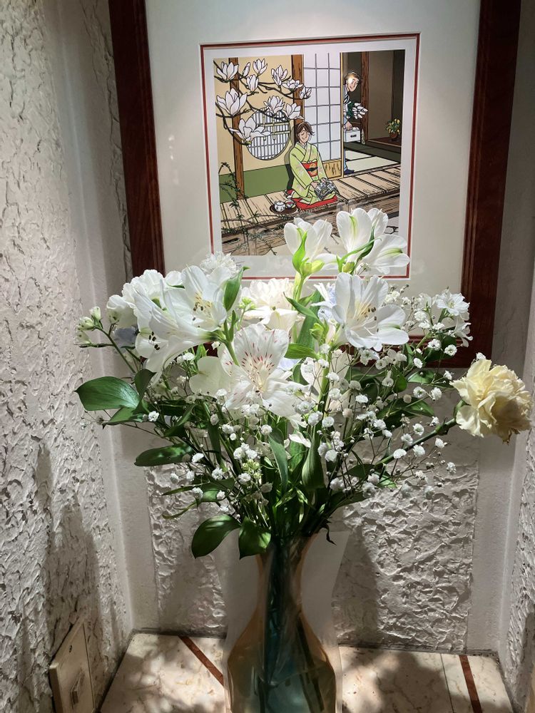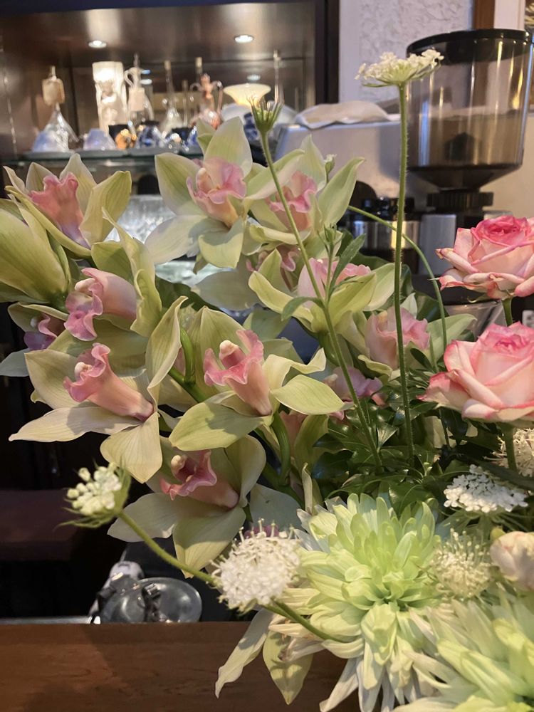 窓辺には、真っ白なトルコキキョウ、アルストロメリア、カウンターにはバラと蘭に飛騨高山のお雛様🎎が飾ってありました💐