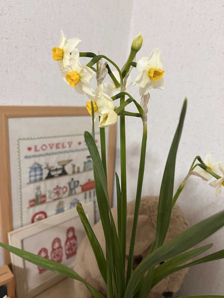 ④最後の水仙をカット✂️してIKEAのワンコ🐶と💛