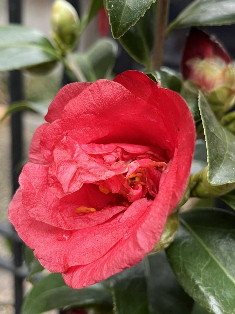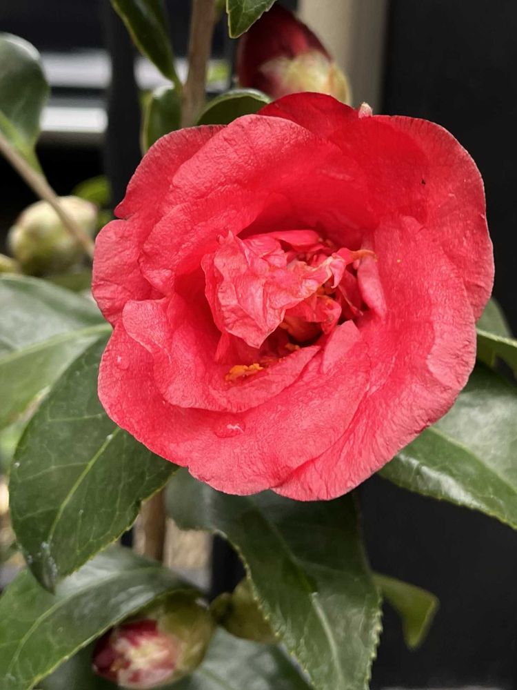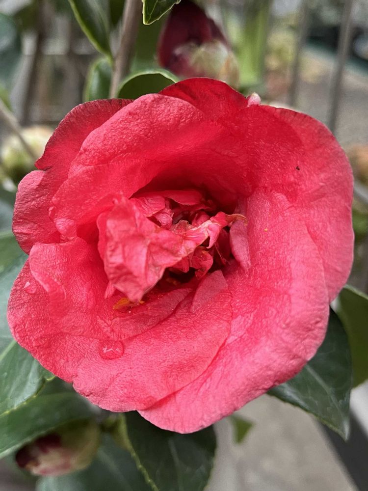 椿・新稀楽(シンキラク)❤️珍しいコを見つけちゃったので、お持ち帰りしちゃいました(* ॑꒳ ॑* )ルン♪*°深みのある紅がイイ👍八重っぽく見えるけど…平開咲きで、雄しべが旗弁化しています🔍w(*゚o゚*)w