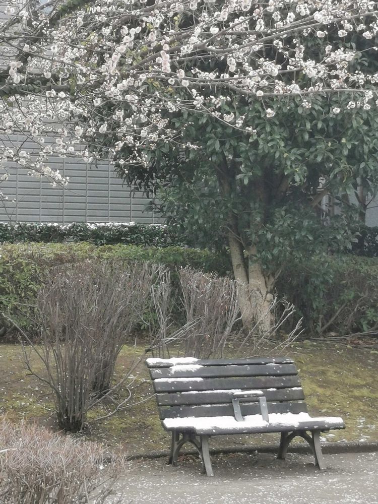 公園のベンチに昨日の雪が残ってました。