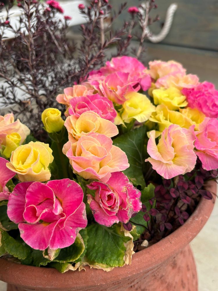 松原園芸さんのプリムラ。寄せ植えには、前から欲しかったぎょうりゅうばいを。このプリムラは、花がクリーム色からピンク色になり、色合いが変化して見応えあります。今日は、雨で濡らさないように、ちゃんと屋根下に移動しました。