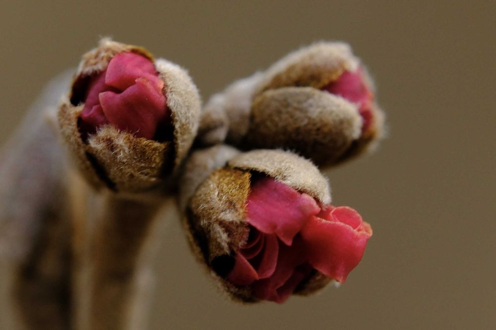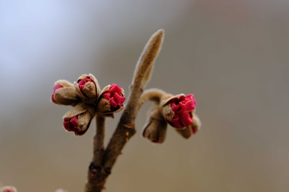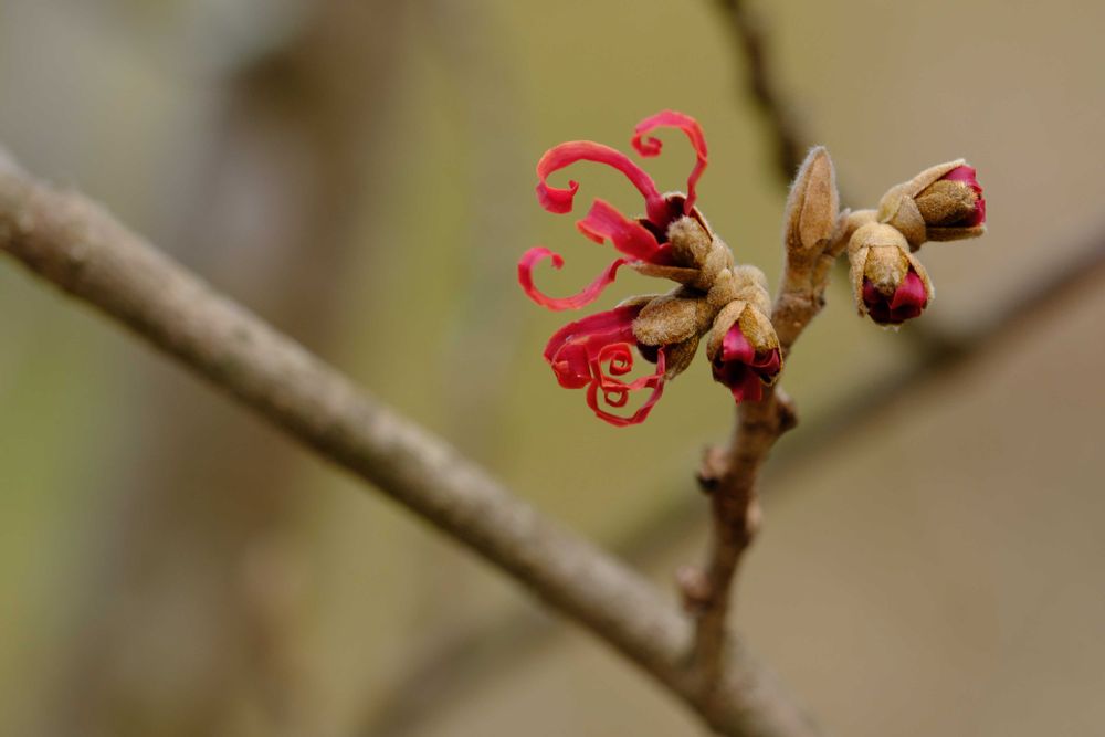 「マンサクとシナマンサクの交雑品種。花つきが良く、花は赤色で、花弁は細長いリボン状です。黄色-赤色に紅葉します。」