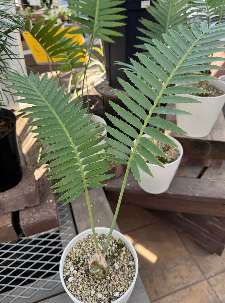メキシコ原産の希少種ディオーン・スピヌロスムです。非常に強健なソテツの仲間で、耐寒性が強く管理が楽な植物です肉厚で光沢のある葉が集まり、羽のような葉を広げます。成長はとてもゆっくりですが、成長すると根本が膨らんでいき、幹立つするとその価値は何倍にも上がります。 暑さや乾燥に強い反面、寒さに弱い植物です。 冬場に屋外に置いても枯れることはありませんが、霜や冷たい風が当たらない場所に移動するのがよいでしょう。 雪が降り積もるような地域では、幹に藁などを巻いて防寒対策が必要になります。