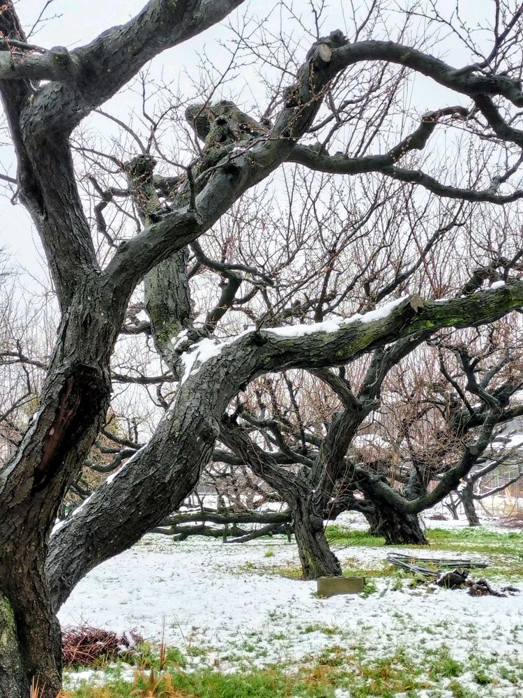 昨夜の雪がプラム畑にうっすら残っています☘️