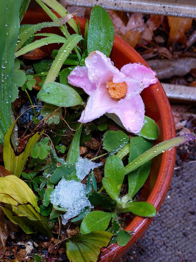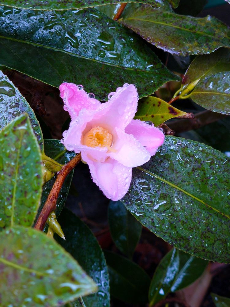 ちょっと凍えているのかな🧐 今朝のうちのツバキです😀 ⛄️と寒さに耐えて、朝を迎えましたが、まだ冷たい雨が降っています☔