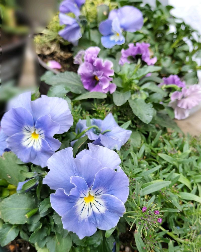 ①パンジー プティシャトン アクアリップル…買ってよかった素敵な花色。真ん中はファルダその後ろはまたプティシャトンです🤗🩵💟