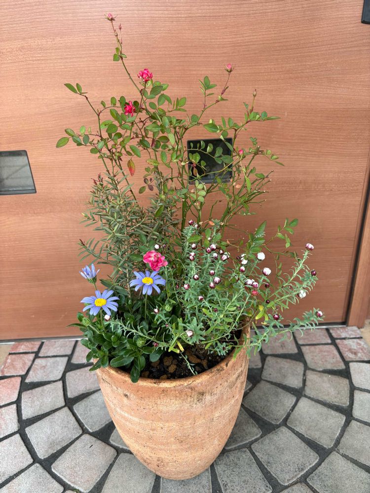 2年前の春の寄せ植えに使って、その後も寄せ植えに使ってたけど、去年の秋は、お花もないし、元気なかったから庭の隅っこに置いてたけど、蕾をつけてたから寄せ植えに使ってみました