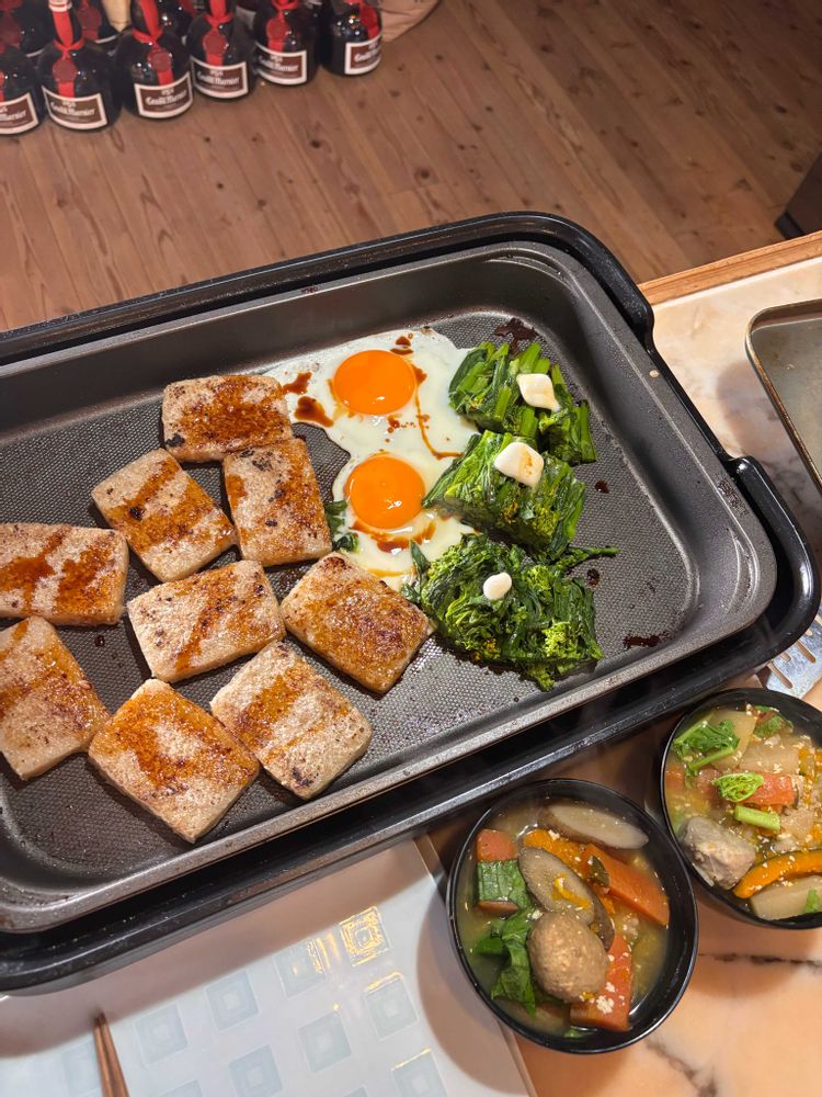 すえすえさんの目玉焼き、,つみれ汁、人参、牛蒡、大根,玄米餅、バター醤油焼きの投稿画像