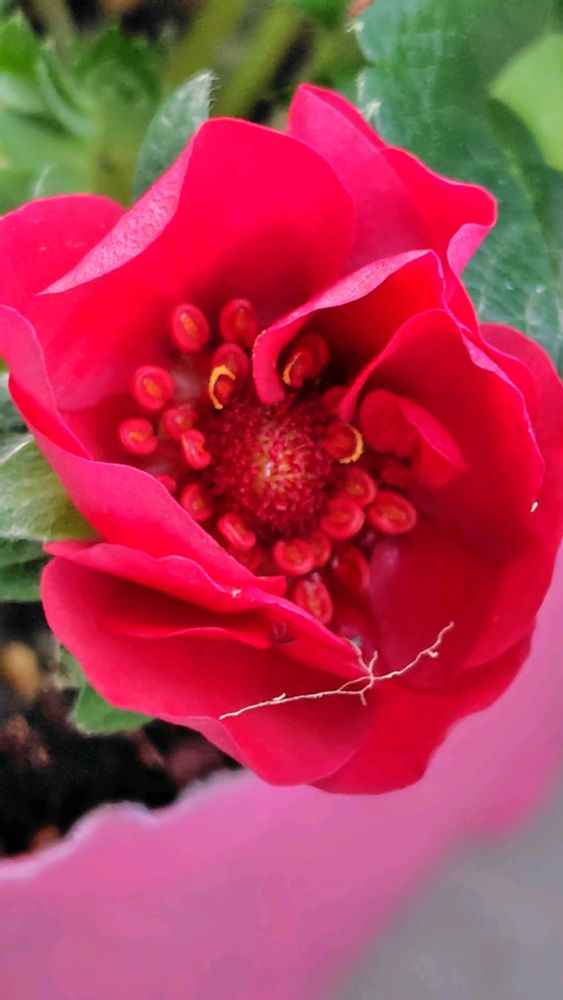 真っ赤なイチゴ🍓の花思わずお迎えしちゃいました。この田舎にも出回るくらいですからすぐに出会えますよ😆😆
