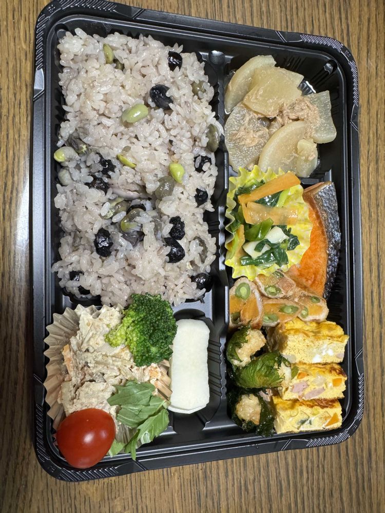 1枚目・今日は黒豆と黒枝豆の親子ご飯・大根のシーチキン煮・焼き鮭・ネギとイカ🦑の酢みそ和え・鶏むね肉の梅シソ揚げ・色々野菜のトルティーヤ・豚肉の野菜巻き・大根の酢漬け・デリ風蓮根・ごぼうサラダでした😋