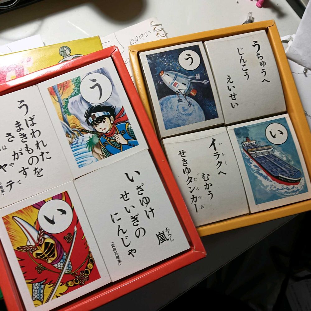👸で、キャラものは値が張るのでこのパチモノ臭い マンガかるた+のりものかるた+変身忍者嵐 の豪華3本セットでたったの600円👍