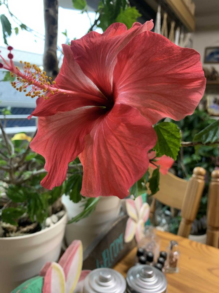 今朝家を出る時に撮った我が家のハイビスカス🌺とプア🐱ちゃんです☺️