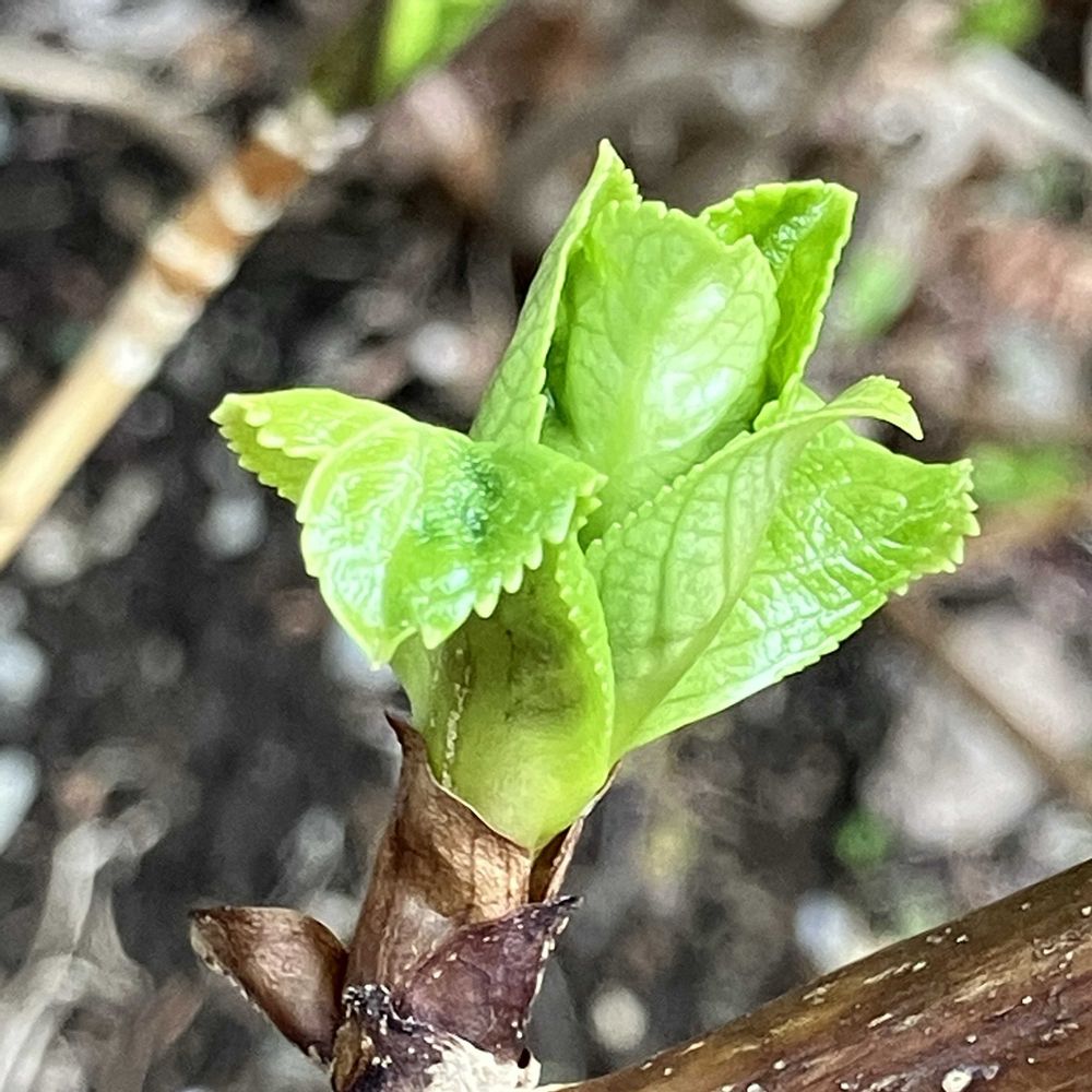 こんなに寒いのに紫陽花の若葉が...、春なんですね〜。