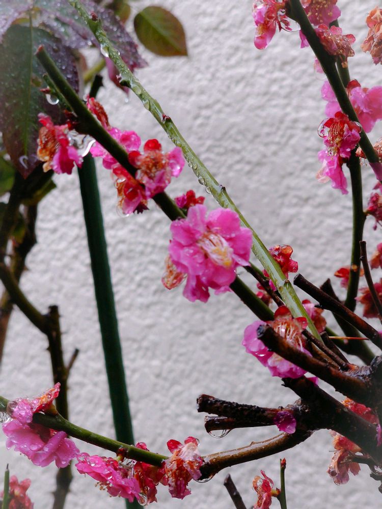 雨が上がった朝のみずみずしい鉢植え紅梅🫧