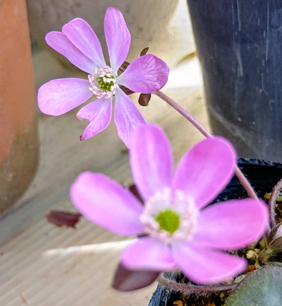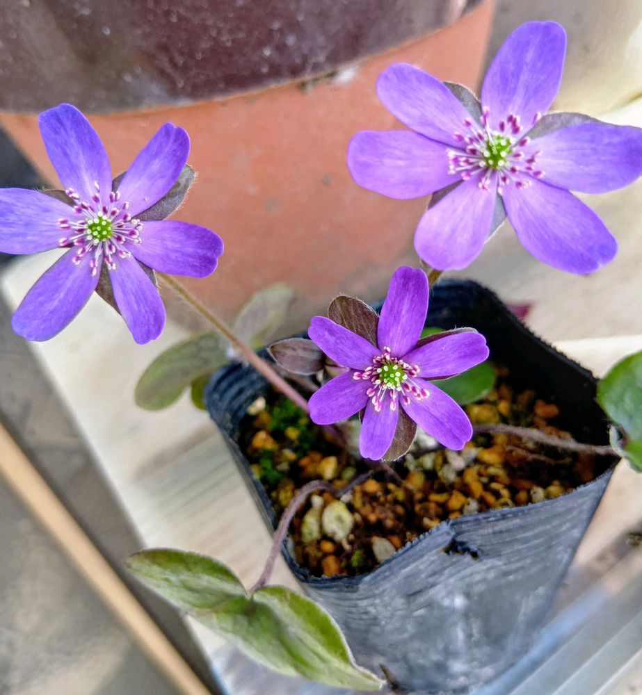 園芸店に雪割草いっぱい ピンクと紫連れて帰りました 小さな花が風で飛びそうでした(⸝⸝⸝⸝˘ ꒳˘)˘꒳˘⸝⸝⸝)ぎゅ💖