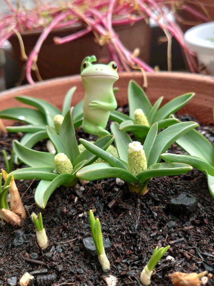 1️⃣ムスカリが育ってきました🌱😊手前はクロッカスです🌱😉カエルちゃんが見守ってくれています😊💕