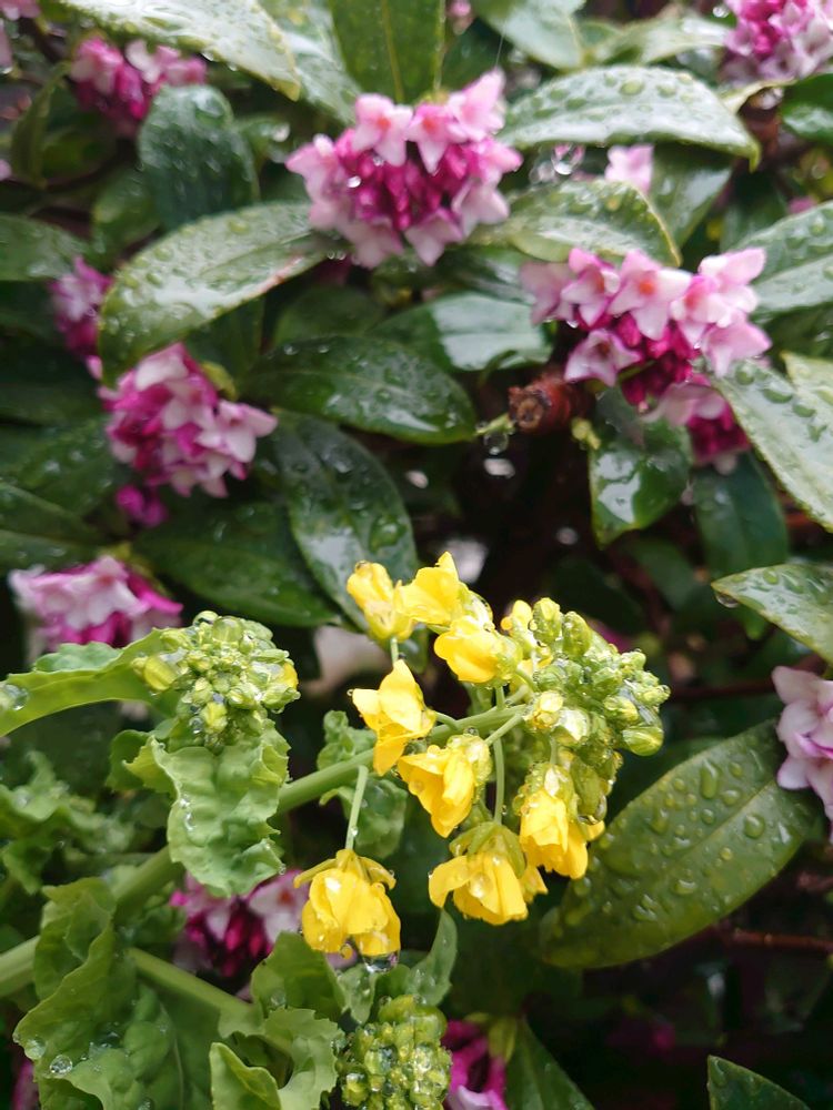 2️⃣菜の花と沈丁花💛🩷前日の雪〜雨になった朝に撮影☔