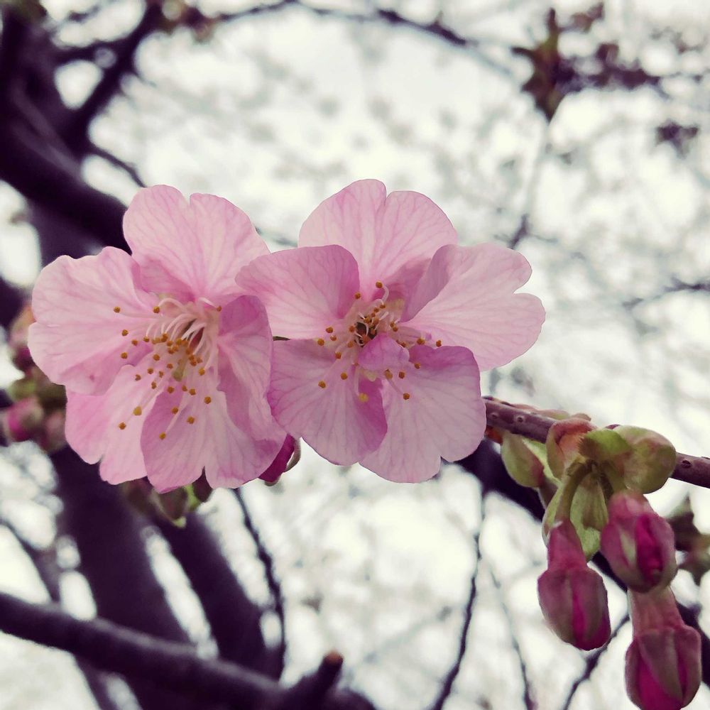 3️⃣4️⃣河津桜が枝に数カ所花をつけました