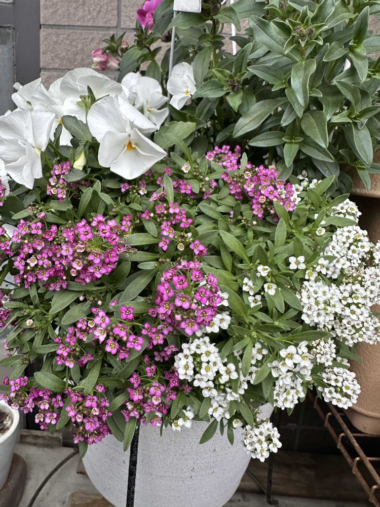 白いビオラもモリモリになりアリッサムもこぼれ落ちそうに咲いています🪴