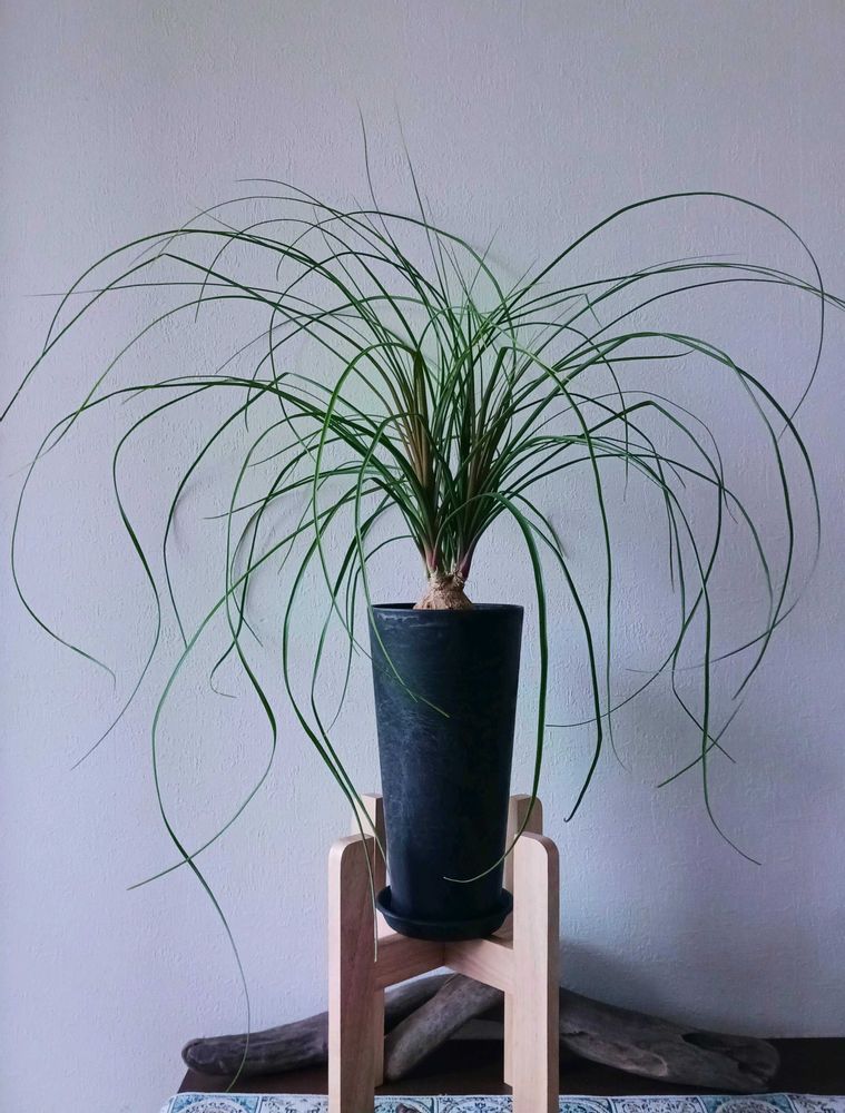 今の時点で葉っぱの展開幅が60cm。360度幅が出るので、成長とともに置場所問題は大きくなってきますね。あと、垂れ下がる葉先が確実に鉢の高さより長くなるので、鉢はどんどん長くなってます🤣しかもとうとう台に乗った💦