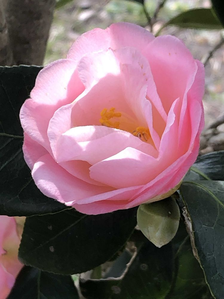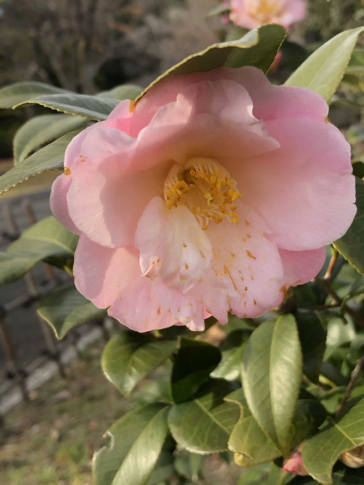 今日はお天気良く、ピンク色の鮮やかなツバキ「春曙紅(シュンショッコウ)」をパチリ!📸🌸🌿😄🌞