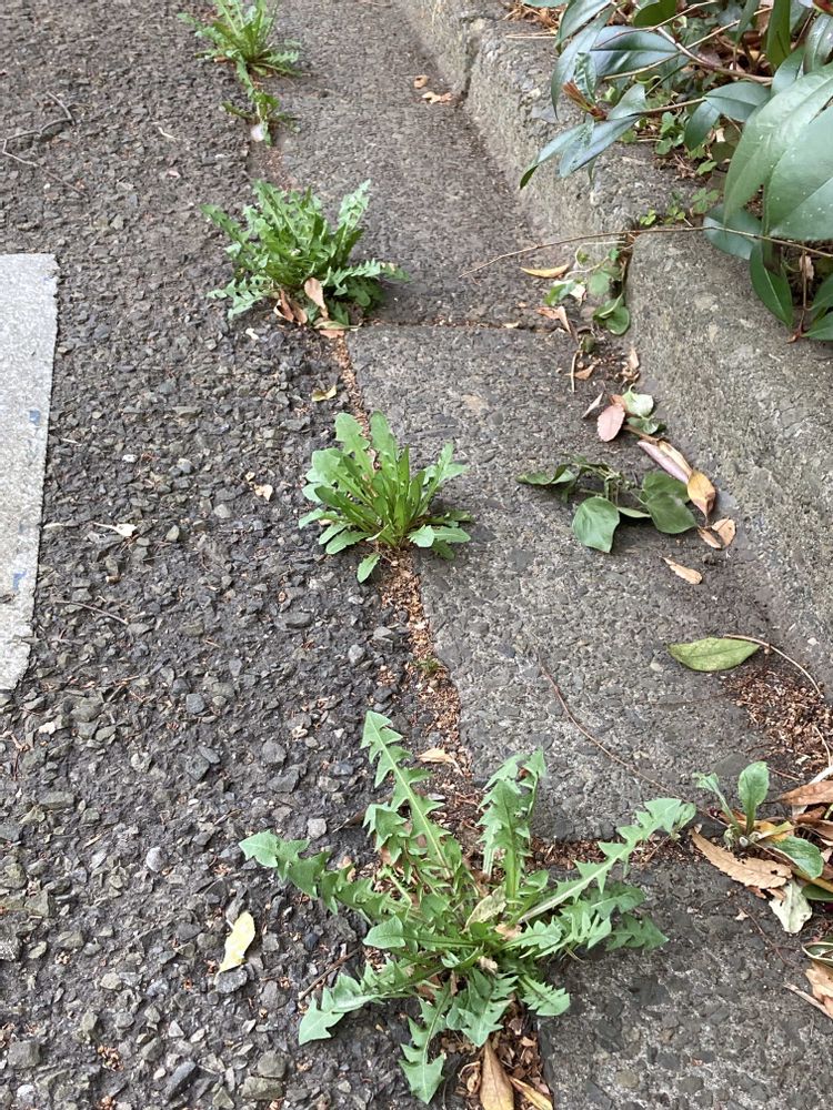 道端。縁石と舗装の境目に一例縦隊です。未だ蕾は見えません。