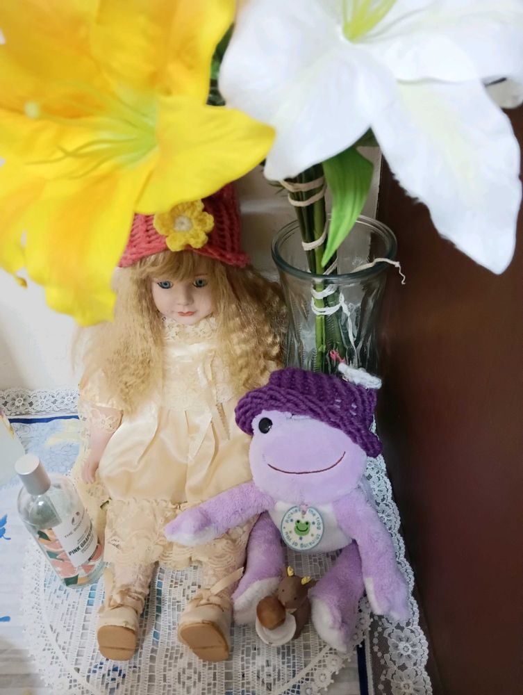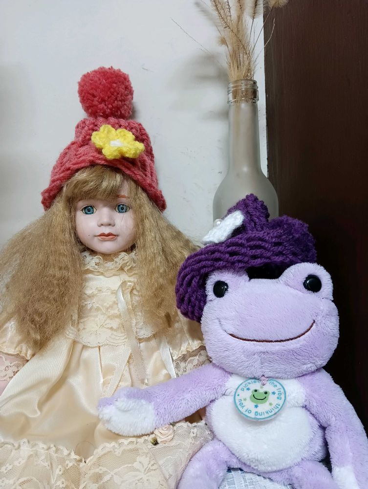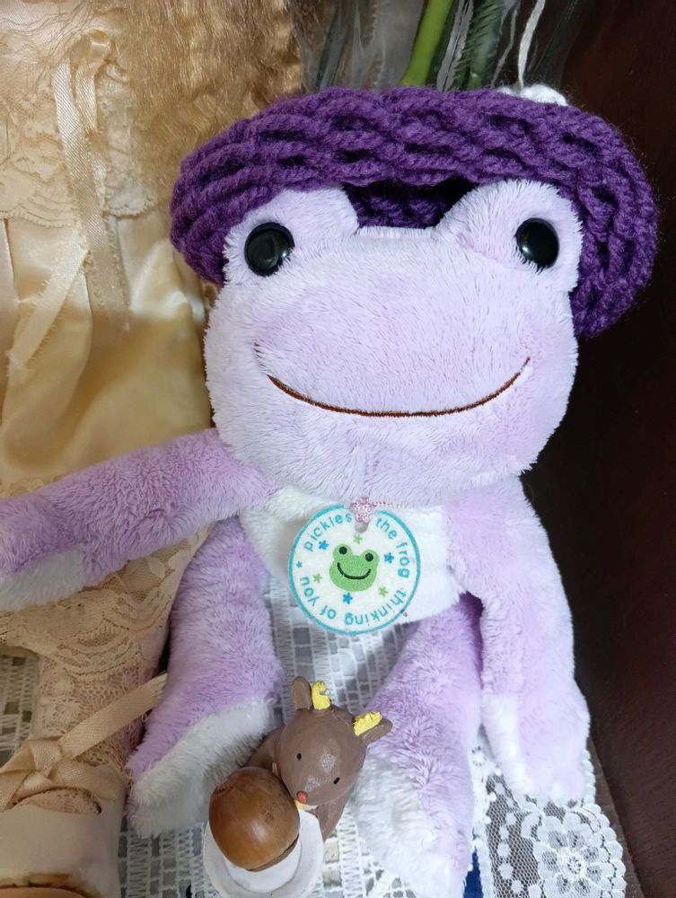 毎月6日はカエルの日😄1日遅ればせながら参加😝今は、東京🗼にいるよ、また寒くなったので、mintさんに、編んでもらった、お帽子、似合う?
