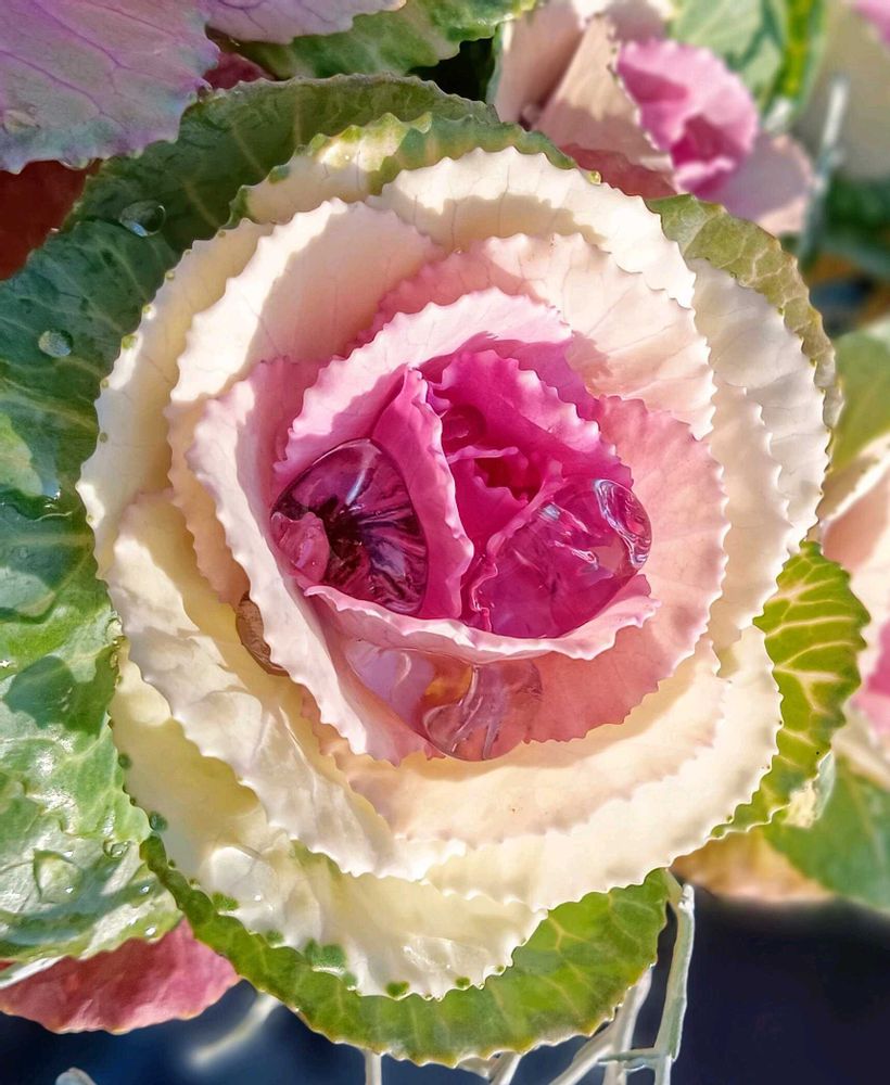庭の葉牡丹に沢山の雨粒が溜まりキラキラしてたので、撮ってみました☺️