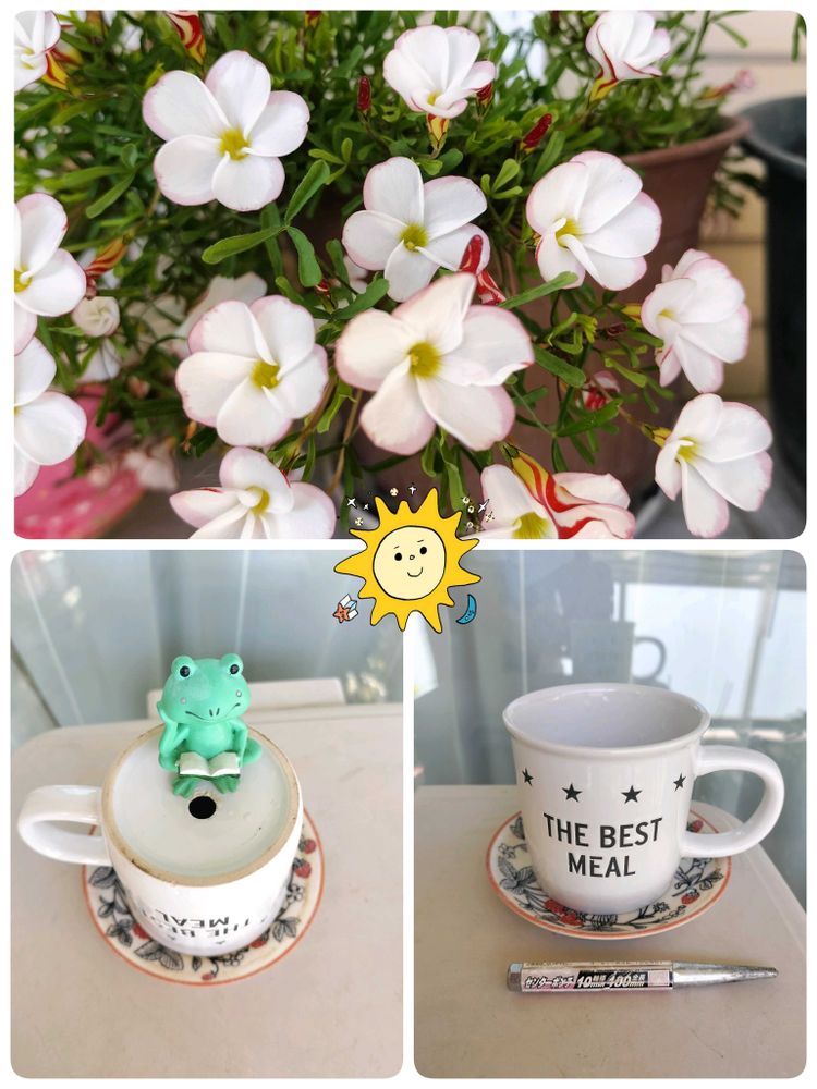 パーシーちゃんと珈琲カップ☕️の鉢に、読書してる🐸ちゃん😊💐