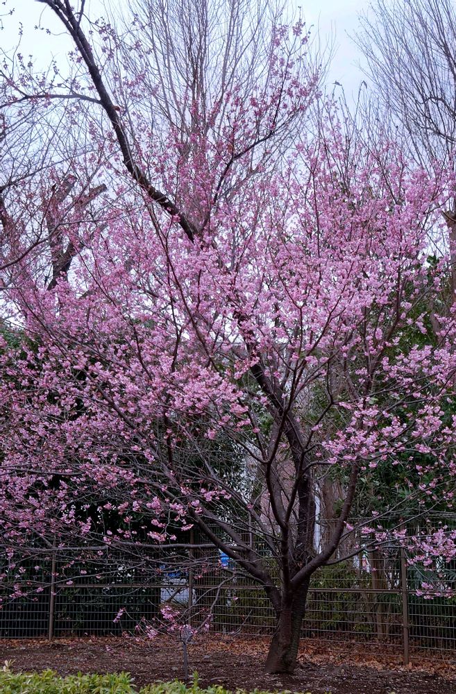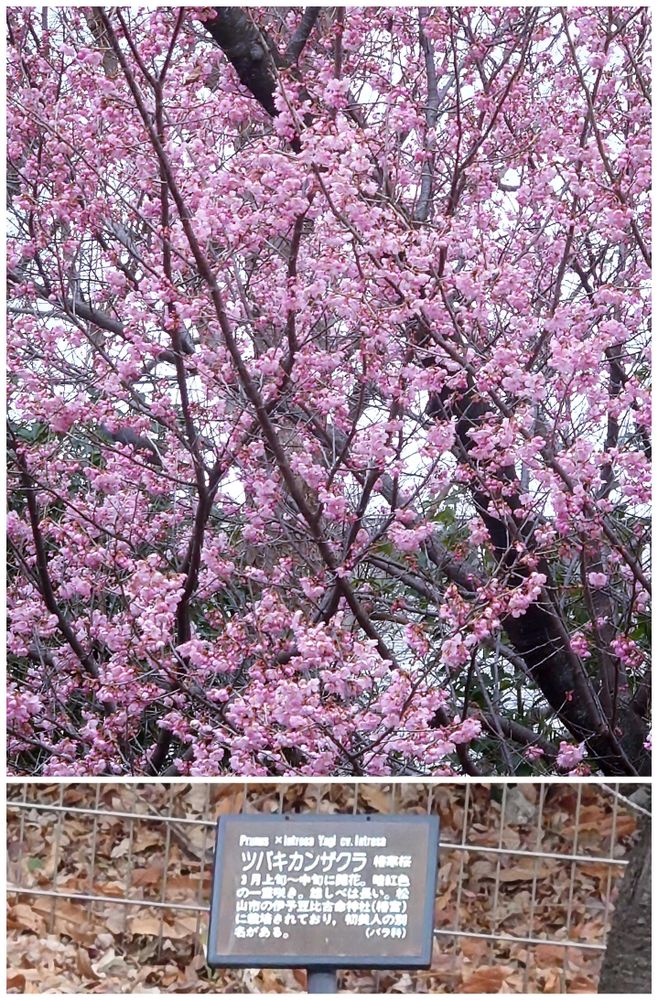 数日の雨天が終わったので、仕事途中での隙間ウォーキング🚶 するといつの間にかたくさん開花していたのは「ツバキカンザクラ」🌸🤩 「初美人」とも言うそうです📖(農業試験場内にて)