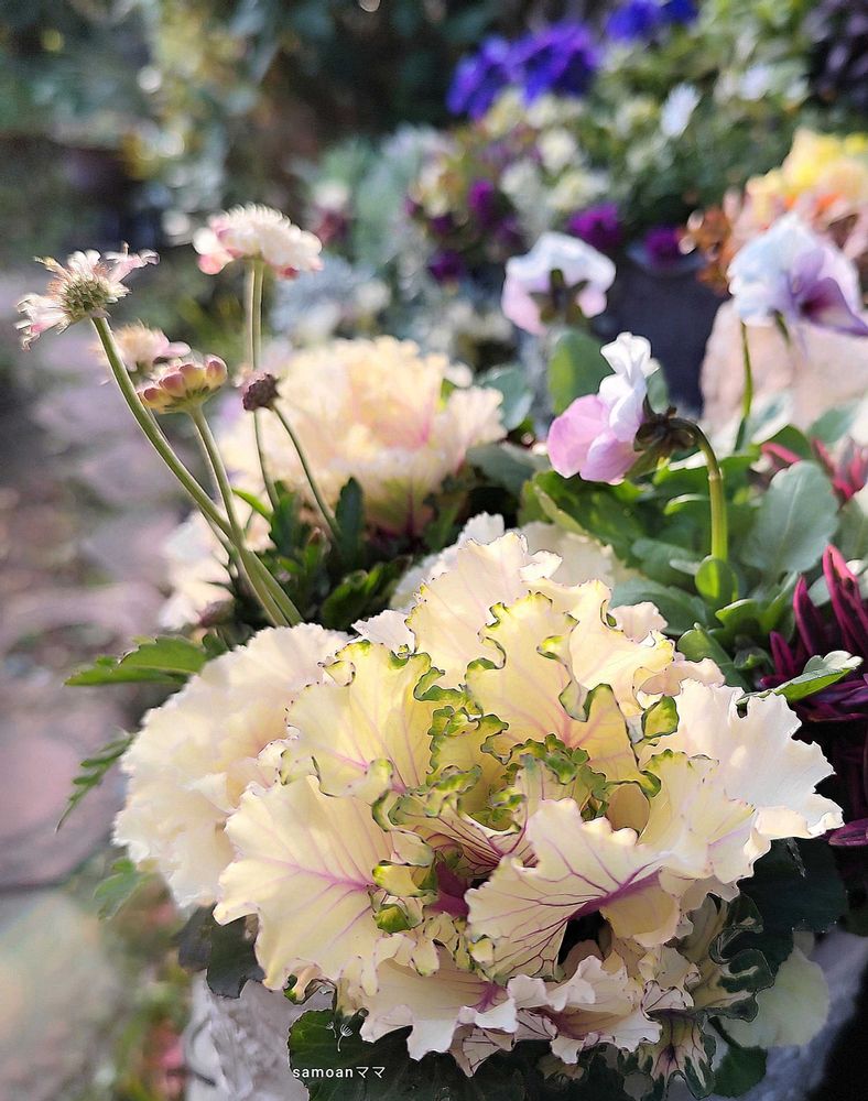 samoanママさんのスカビオサ 白ときどき桃,葉牡丹ヴィンテージブーケ,君待ちビオラの投稿画像