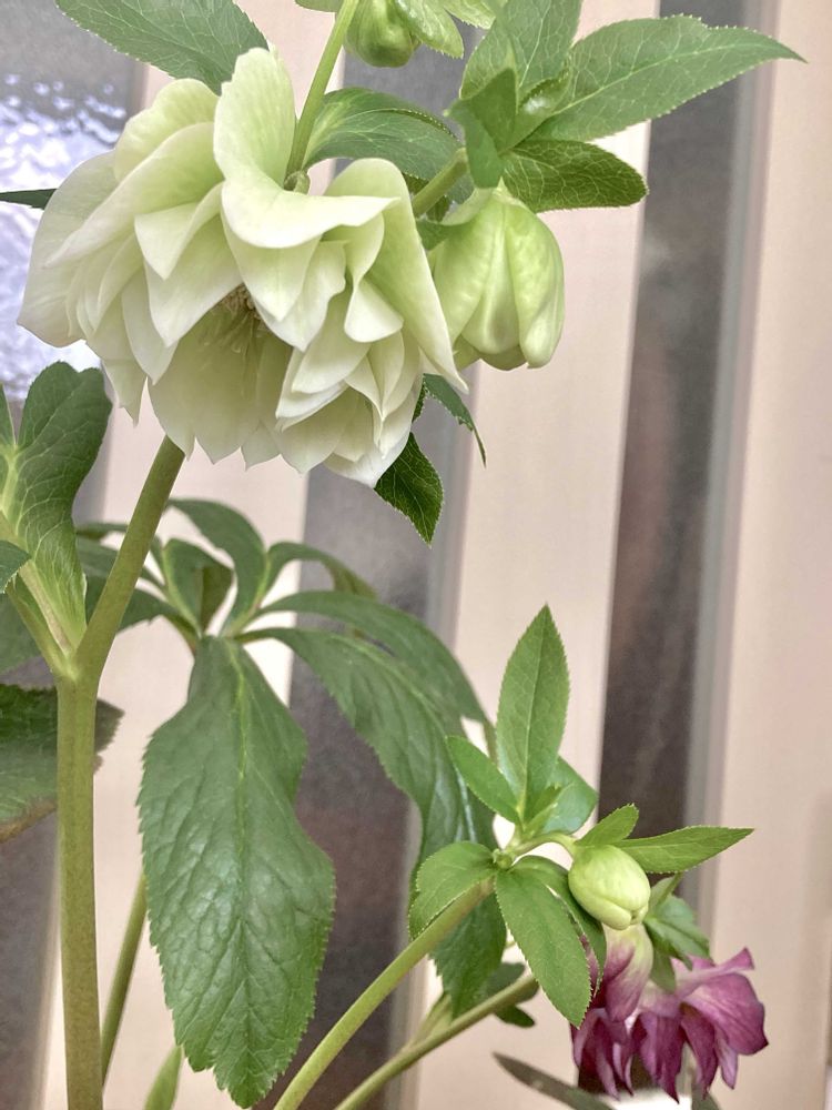 外は雪景色ですが室内は春が近くなって鉢植えのクリスマスローズも咲き始めました